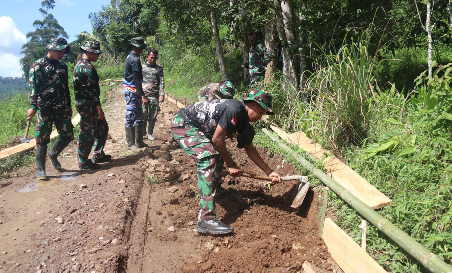 Program TNI Manunggal Membangun Desa (TMMD) Reguler Ke-127 terus berjalan di Kampung Babakan Simpang Gunung Leutik, Desa Cipelah, Kecamatan Rancabali, Kabupaten Bandung. Fokus kegiatan saat ini adalah pemasangan papan bekisting dan pengecoran jalan beton.