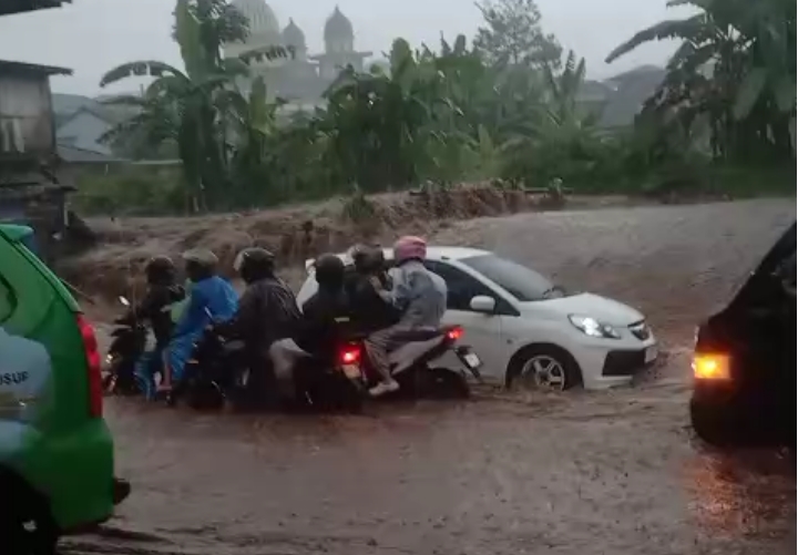Sejumlah pengendara roda dua tampak kesulitan melintas karena derasnya aliran air yang membawa lumpur dari sisi jalan. Kondisi ini sempat membuat akses warga terganggu, terutama saat volume kendaraan meningkat menjelang sore.