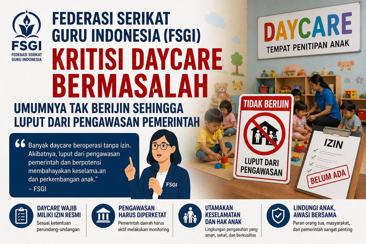 Federasi Serikat Guru Indonesia (FSGI) mengecam keras atas kekerasan dan kekejian terhadap 53 Balita yang dititipkan di daycare Little Aresha Kota Jogjakarta. Kekerasan dilakukan oleh para pengasuh. Pihak kepolisian sudah melakukan penahanan pada 13 terduga pelaku dan proses hukum akan terus berlanjut.